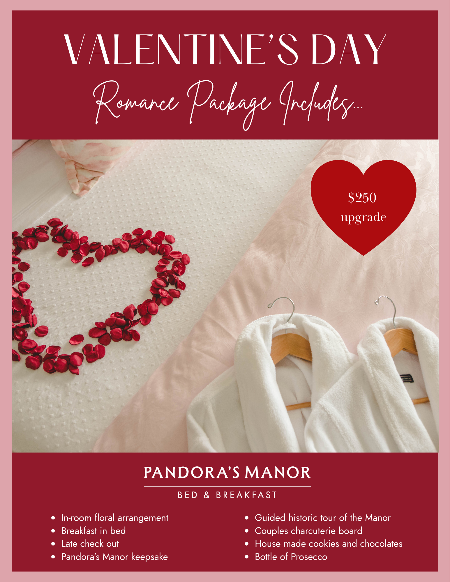 Add romantic touches to your Valentine's Day stay for a $250 upgrade to any room reservation.