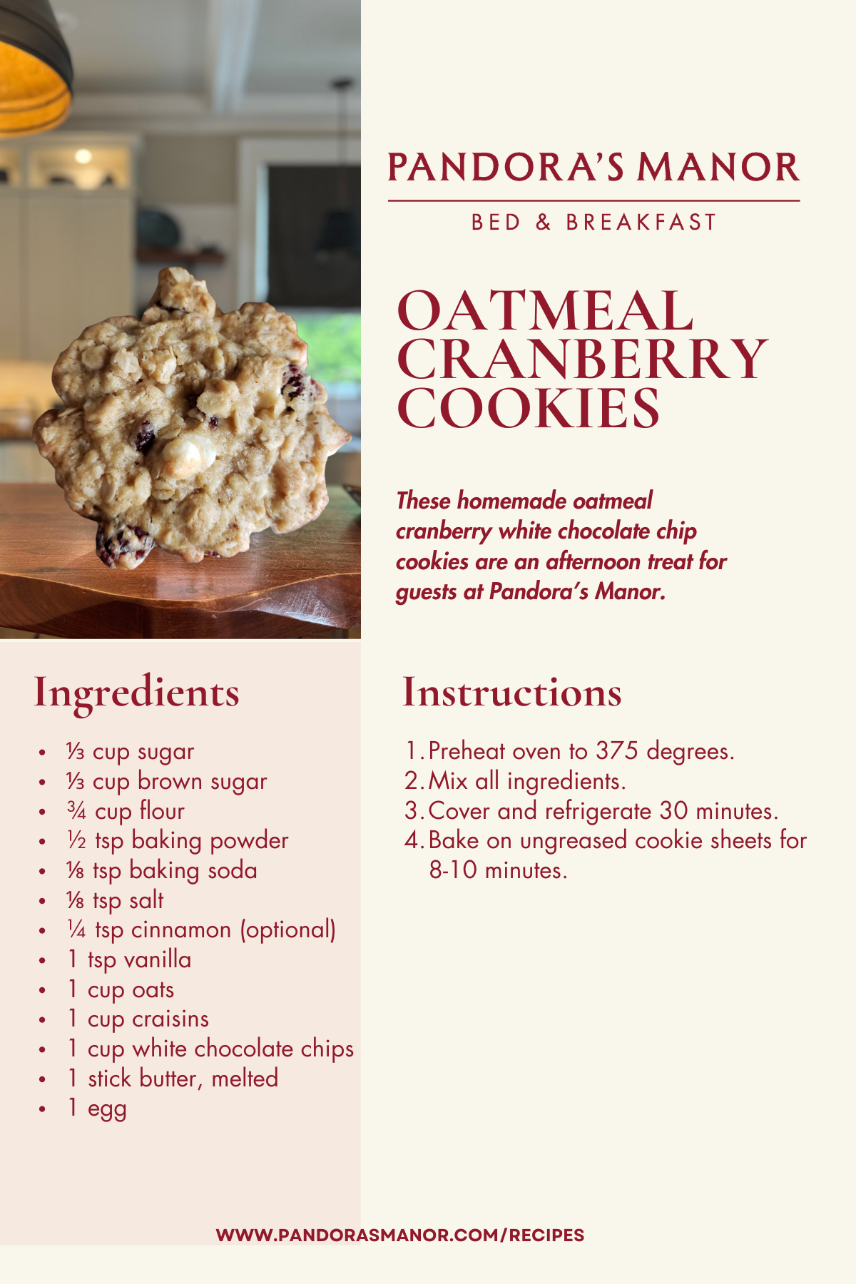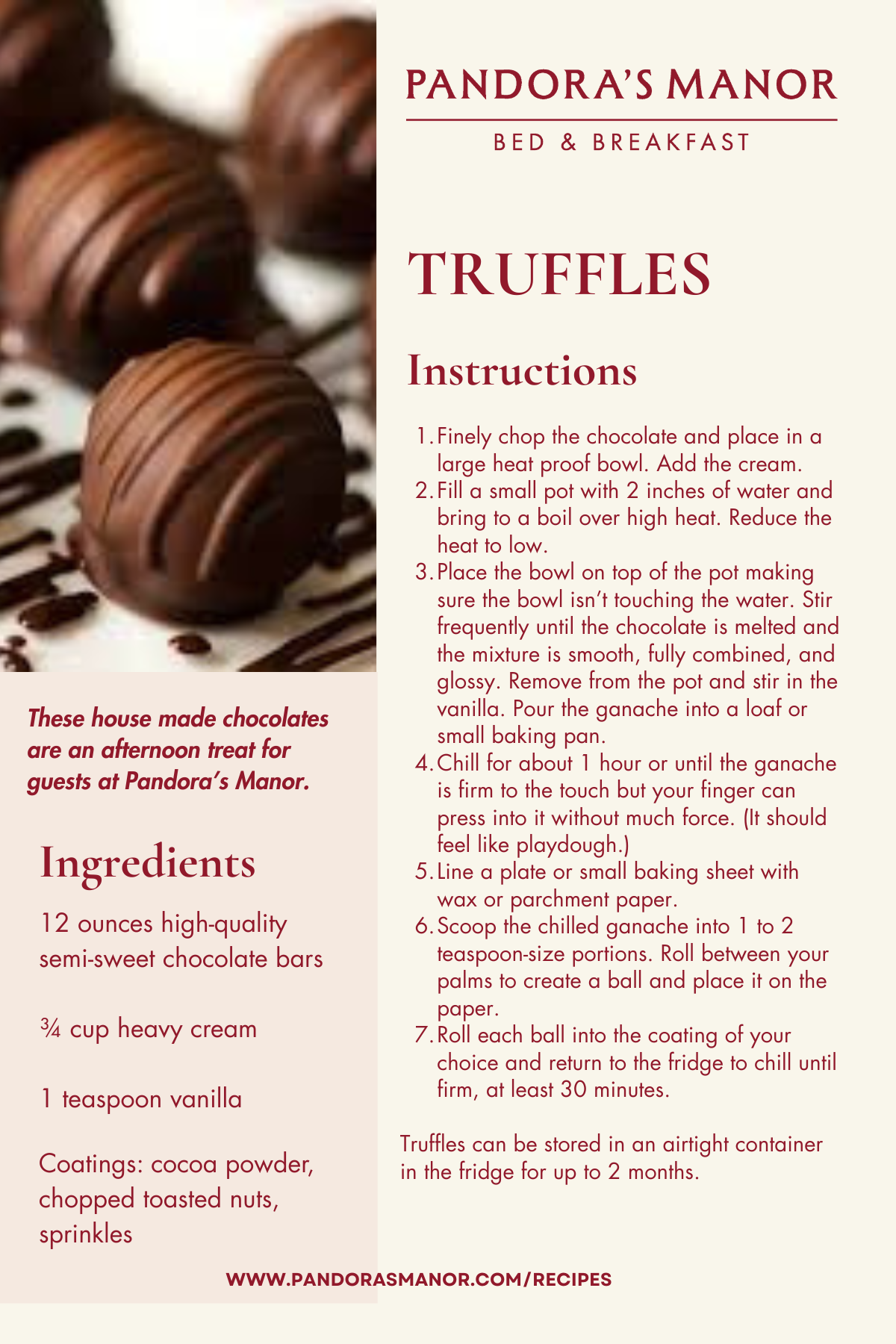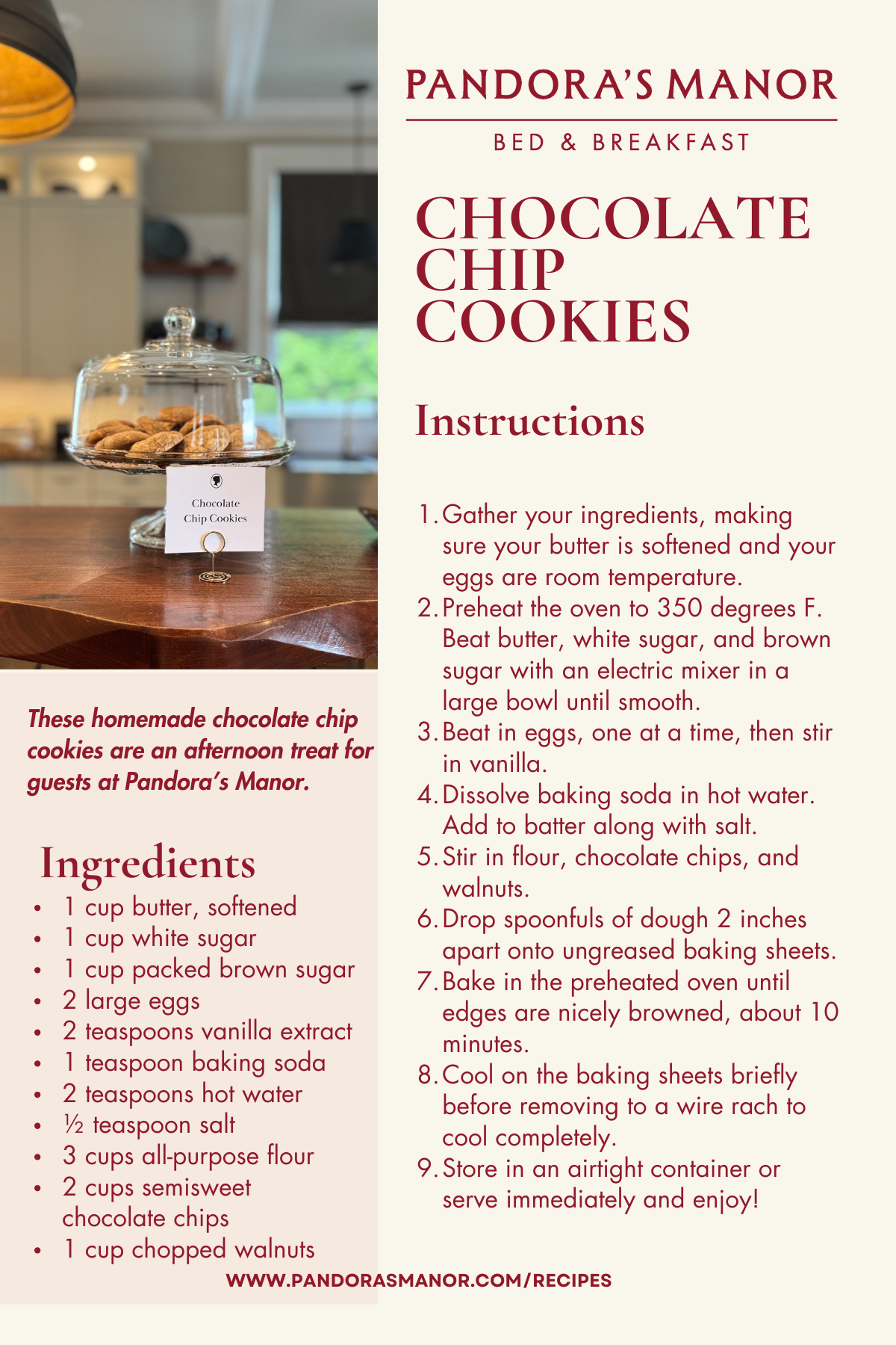 Each morning our guests enjoy a gourmet breakfast and each afternoon they delight in house made cookies and chocolates with a complimentary glass of wine or beer. Here we share some of our favorite manor recipes that our guests enjoy. We hope you enjoy them at your home too!